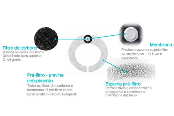 Único filtro circular completo responsável pelo equilíbrio ideal para redução do balonamento causado pelos gases. Com um pré-filtro de círculo completo protege o carbono e a membrana das fezes e garante vida útil mais longa.